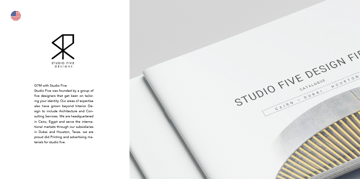 Studio Five was founded by a group of five designers that get keen on tailoring your identity. Our areas of expertise also have grown beyond Interior Design to include Architecture and Consulting Services. We are headquartered in Cairo, Egypt and serve the international markets through our subsidiaries in Dubai and Houston, Texas. GEMI7 are proud did Printing and advertising materials for Studio Five, USA..