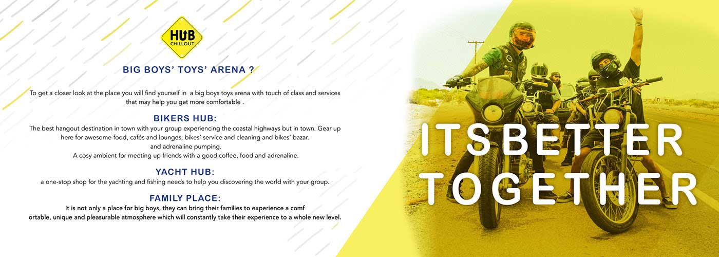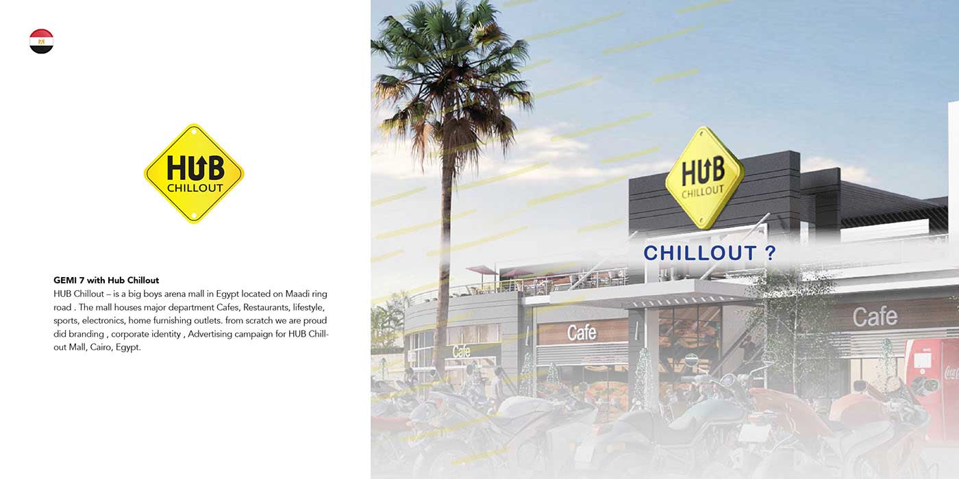 HUB Chillout - is a big boy's arena mall in Egypt located on Maadi ring road. The mall houses major department Cafes, Restaurants, lifestyle, sports, electronics, home furnishing outlets. from scratch we are proud did branding, corporate identity, an Advertising campaign for HUB Chillout Mall, Cairo, Egypt.