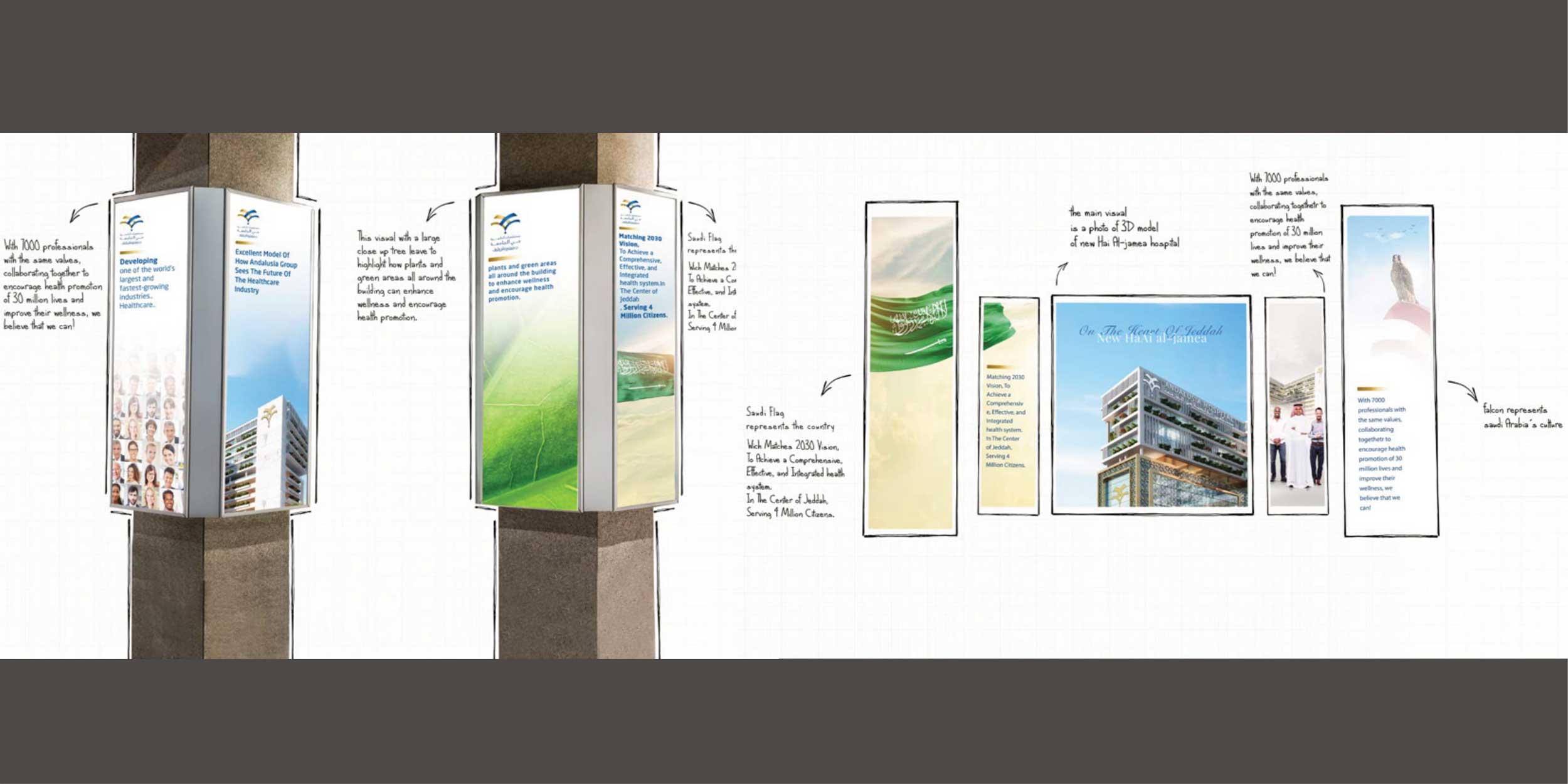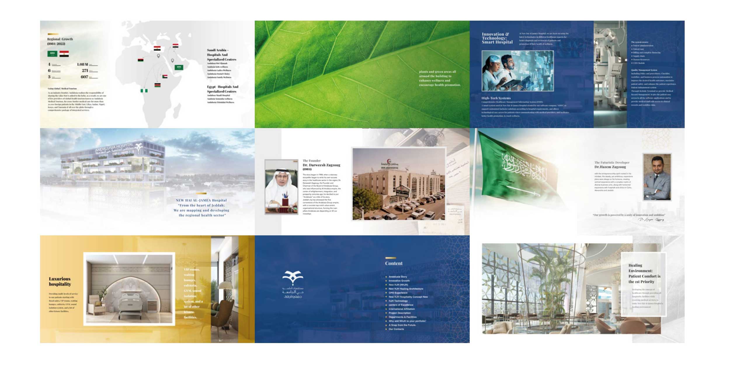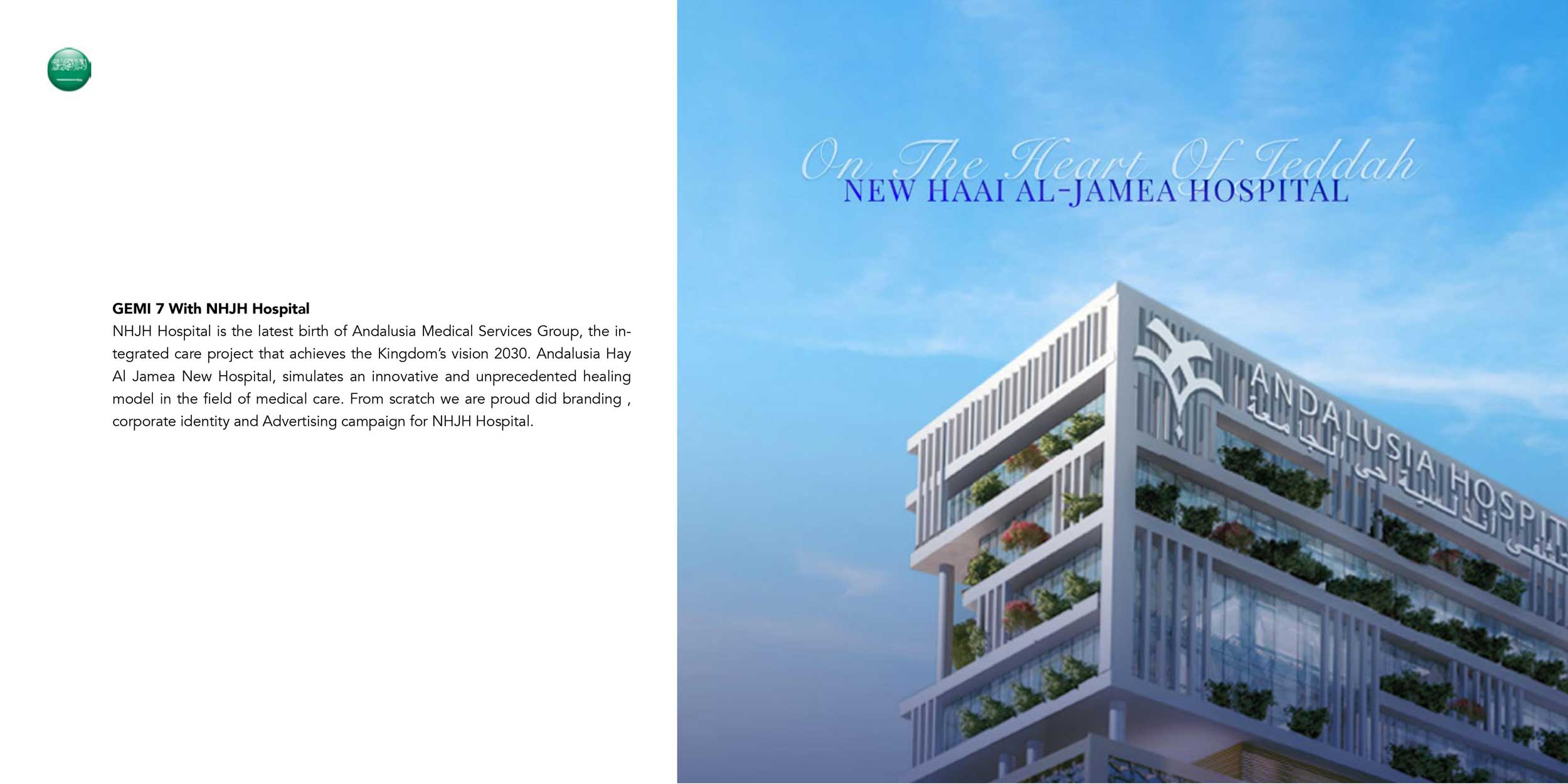 NHJH Hospital is the latest birth of Andalusia Medical Services Group, the integrated care project that achieves the Kingdom’s Vision 2030. Andalusia Hay Al Jamea New Hospital simulates an innovative and unprecedented healing model in the field of medical care. From scratch, in collaboration with Andalusia Cheerful Studio, we did the branding, corporate identity, sign system, and creative direction of Andalusia New HJH, Jeddah.
