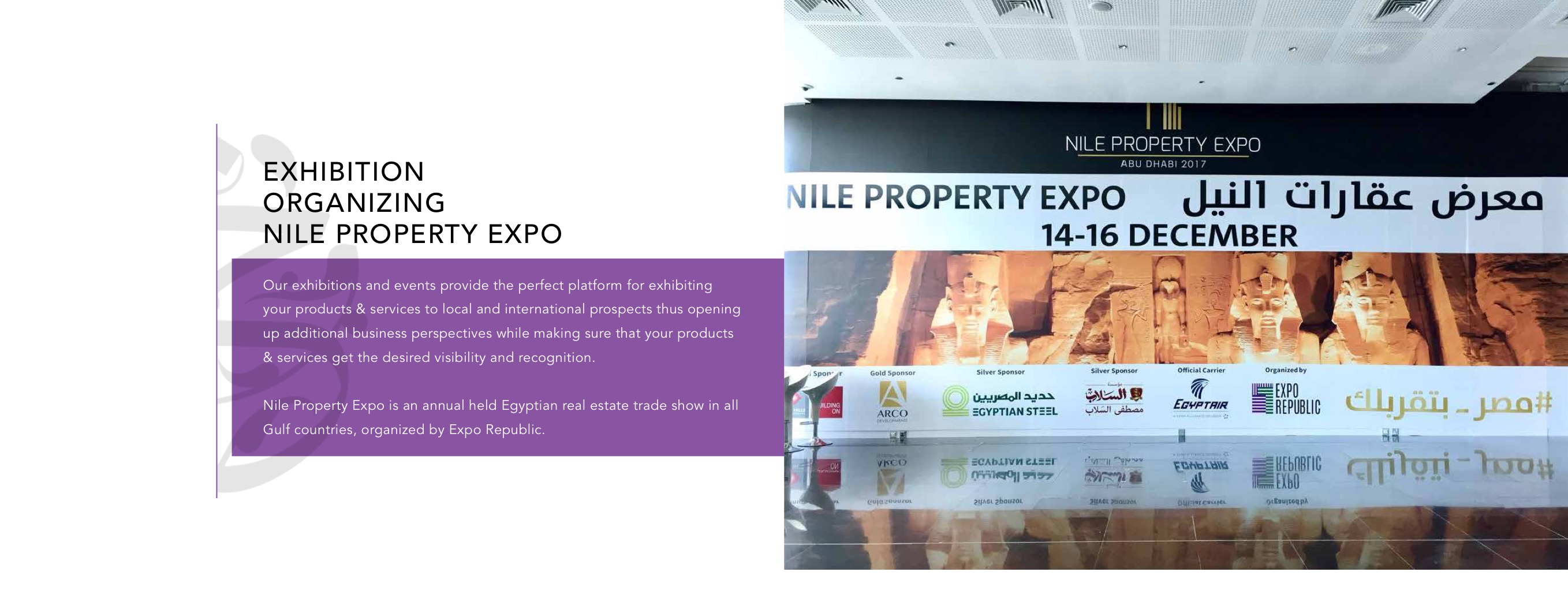 Expo Republic is an Egyptian Emirati exhibition organizer committed to connecting various businesses from all around the globe, to all platforms willing to deal directly or indirectly with exhibitors, through our major organized annual events in many cities of the world, mostly in GULF.from scratch we are proud did branding , corporate identity ,portfolio design for Expo Republic, Dubai, emirates ..