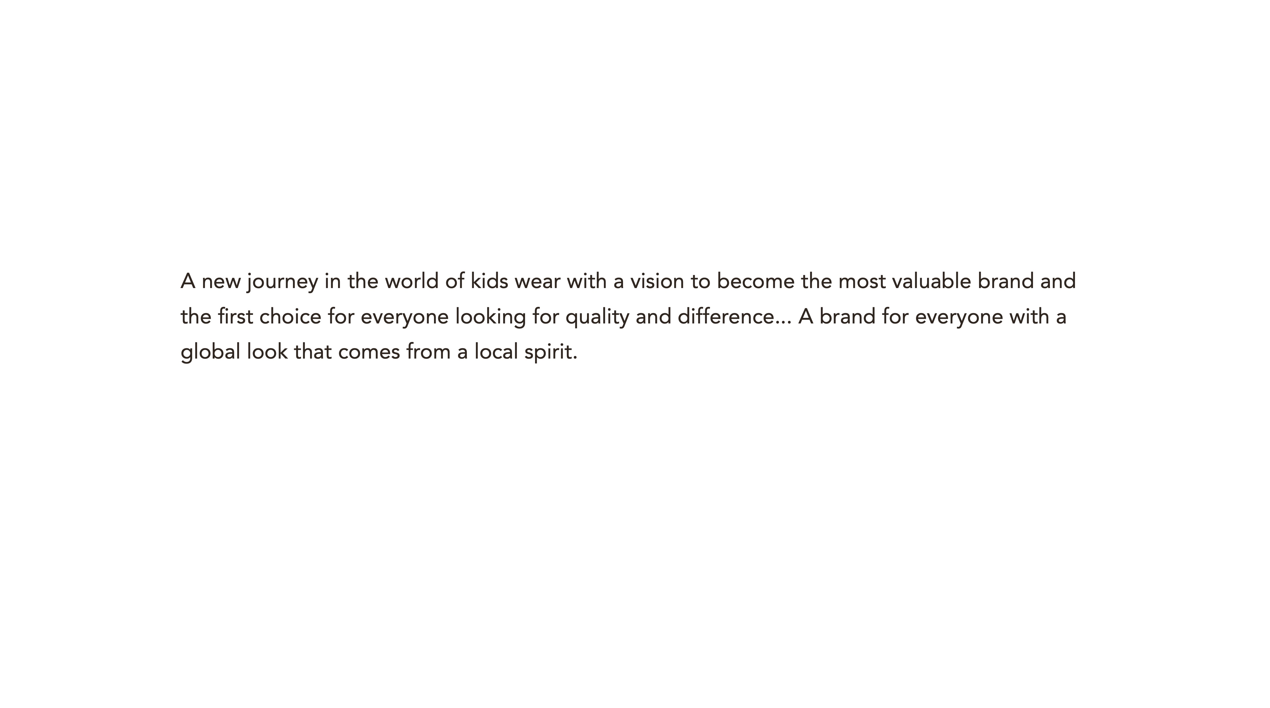 A new journey in the world of kids wear with a vision to become the most valuable brand and the first choice for everyone looking for quality and difference... A brand for everyone with a global look that comes from a local spirit.